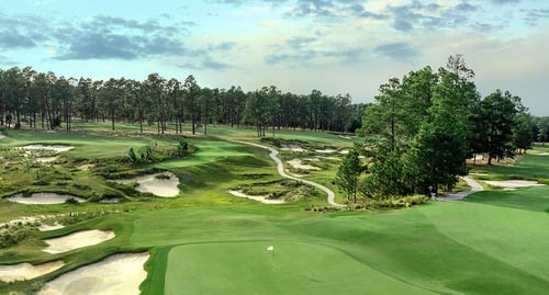 Pinehurst No. 10, Tom Doak’s newest design, winds through dramatic dunes and ridges with 75 feet of elevation change, offering bold greens and sweeping views.